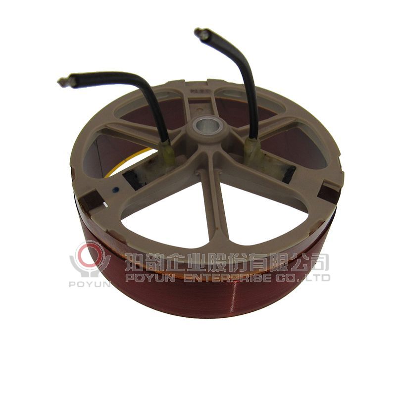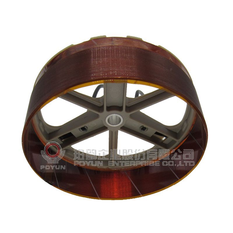扁綫音圈粘合支架,一層立繞,引綫用銅片引出后再接加黑色絕緣套管的錦絲綫。